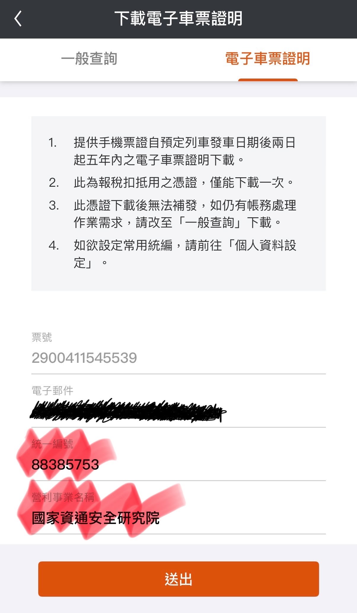 • 車票號碼:車票號碼